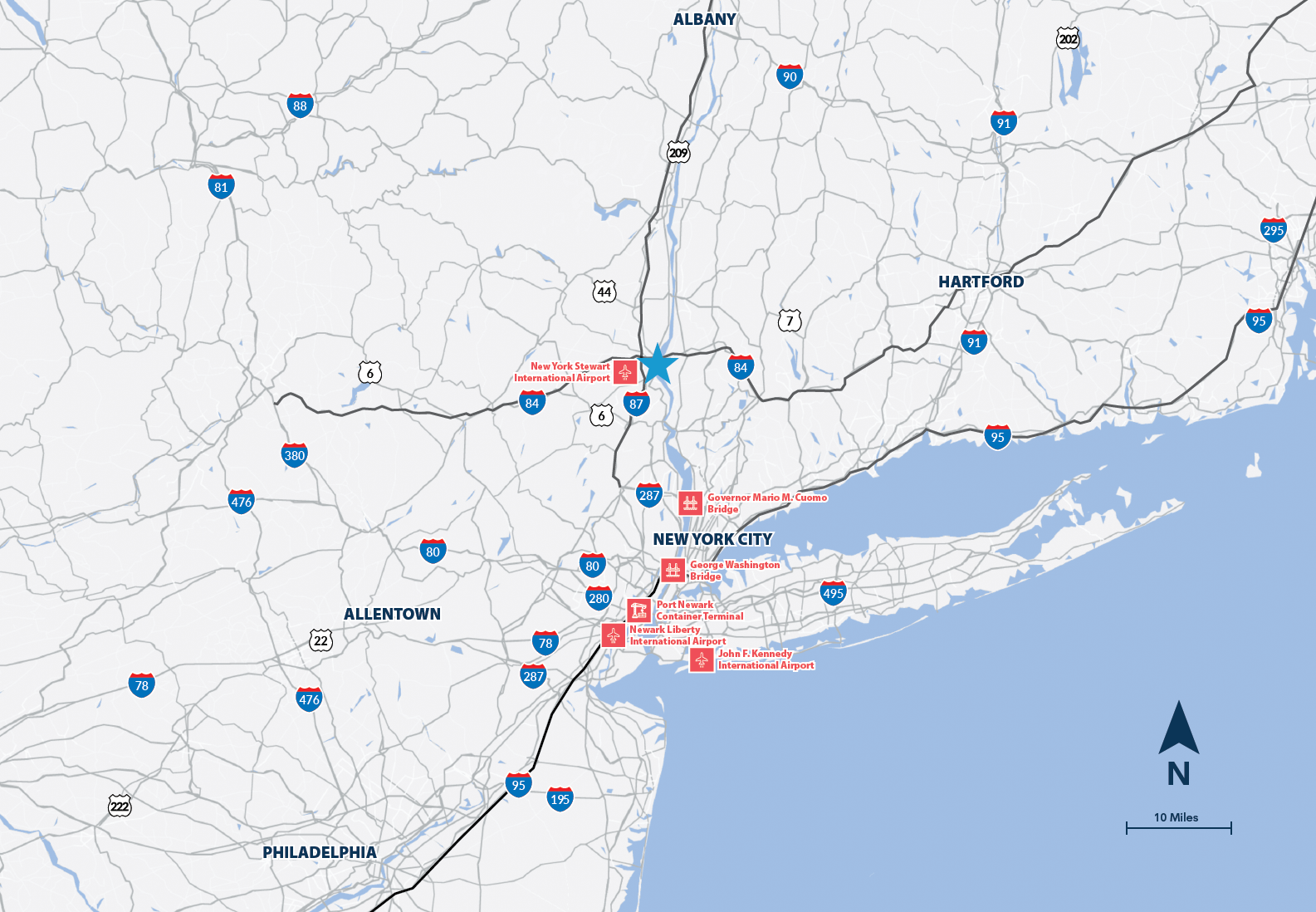 This site is less than one mile from I-84 and is 2 miles to the intersection of I-84 and I-87. New York City and Northern New Jersey are within a one-hour drive. The strong demographics of the entire Northeast Corridor are accessible to Newburgh South Logistics Center.